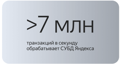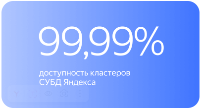 СУБД Яндекса соответствует строгим требованиям по доступности и сохранности данных. При отказах, технических работах и обновлениях гарантируем близкое к нулевому время простоя. Система восстанавливается автоматически и выдерживает отказ одного дата-центра и дополнительной серверной стойки.